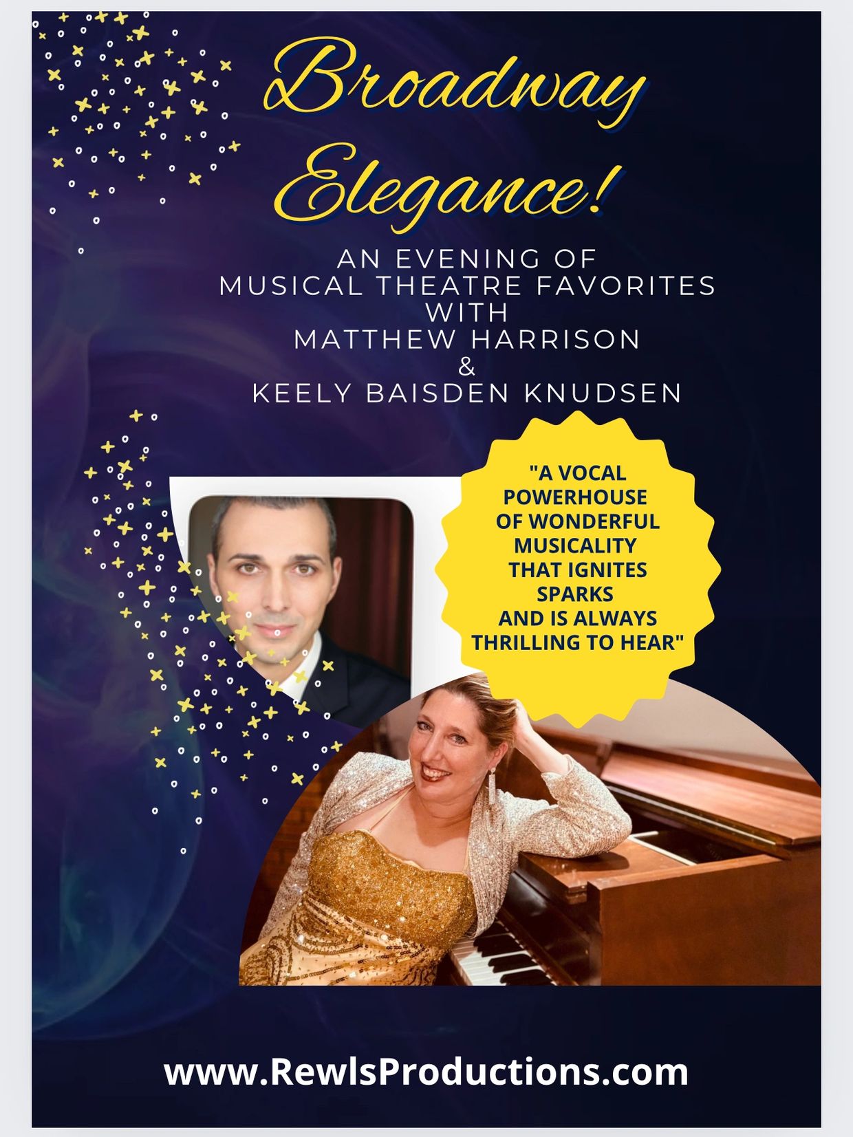 Join world renown pianist and vocalist Matthew Harrison and award-winning musical theatre performer Keely Baisden Knudsen for a tremendously entertaining performance full of sparkle, sizzle, elegance and humor. ELEGANCE is a celebration of the songs of the Great American Musical!
